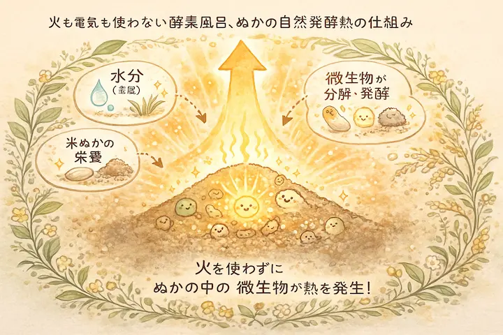 米ぬかに含まれる微生物が、有機物を分解する際に発生させる「発酵熱」だけで、60度〜70度(体感温度は40度前後)という温かさを生み出します。